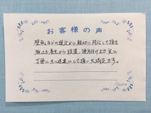 お客様の声 | 壁紙などの選定から親切に対応してもらい、施工も養生から設置・片付けまで実に丁寧且つ迅速にしていただき大満足です。 |